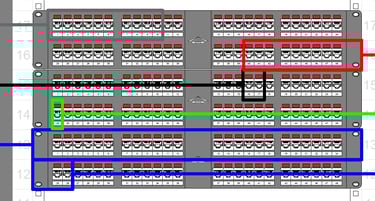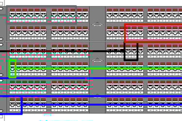 Identificação dos pontos com etiquetas termotransferíveis e mapeamento das interligações em projetos, planilhas e diagramas. Organização final dos racks e patch cords.