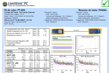 Em caso de falha, o certificador fornece diagnósticos detalhados para ajudar a identificar a causa do problema, como a localização exata de um curto-circuito ou a origem de uma diafonia excessiva.
