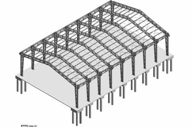 Modelagem preliminar em Revit 3D, com integração entre disciplinas e verificação de interferências geométricas no ambiente BIM.