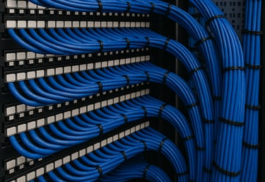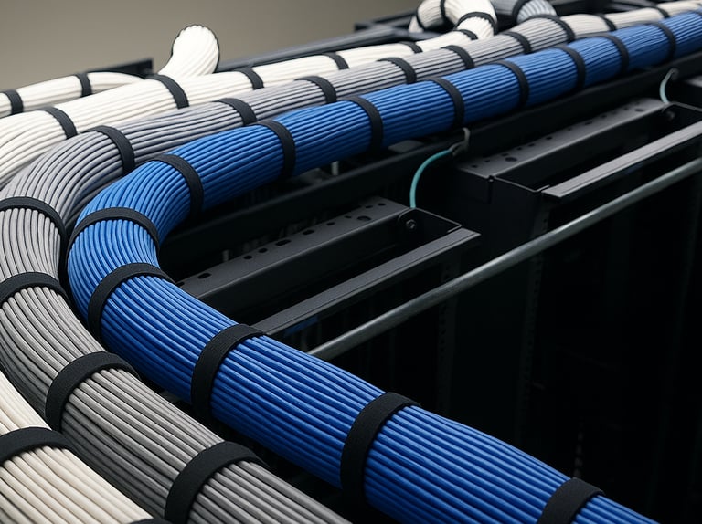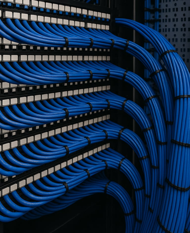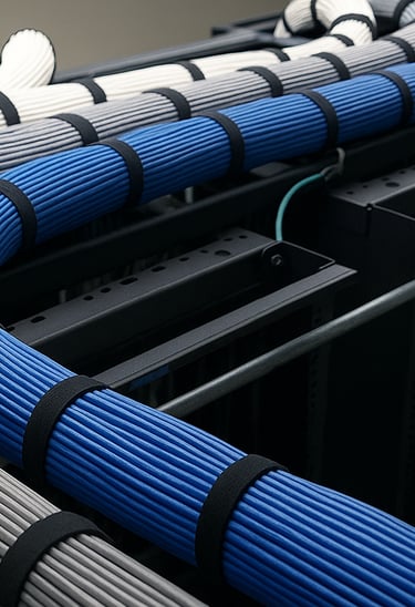 Lançamento de cabos metálicos e ópticos respeitando o raio de curvatura e tração. Organização com velcros, guias e separação física entre energia e dados para evitar interferências.