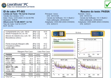 Padrão de teste: A norma técnica usada para o teste (por exemplo, ANSI/TIA-568.2-D, ISO/IEC 11801) e a categoria do cabeamento (Cat5e, Cat6, Cat6A, etc.).