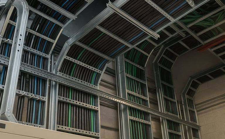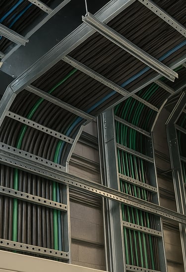 Instalação de eletrocalhas, perfilados, conduítes e caixas de passagem. Fixação de organizadores, suportes e painéis com alinhamento, aterramento e segurança assegurados.